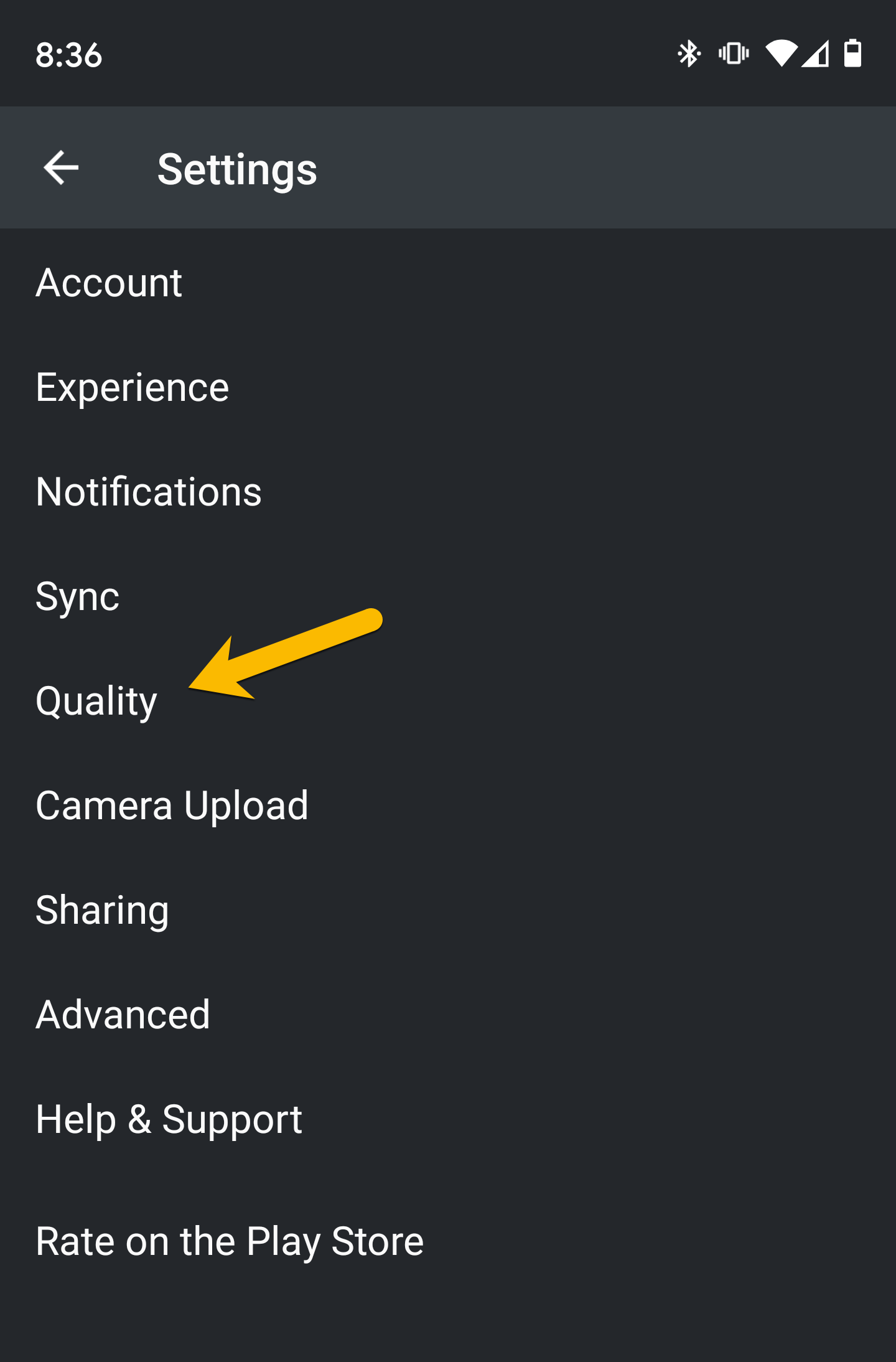 Navigate to the Quality section from the Settings menu by selecting it.