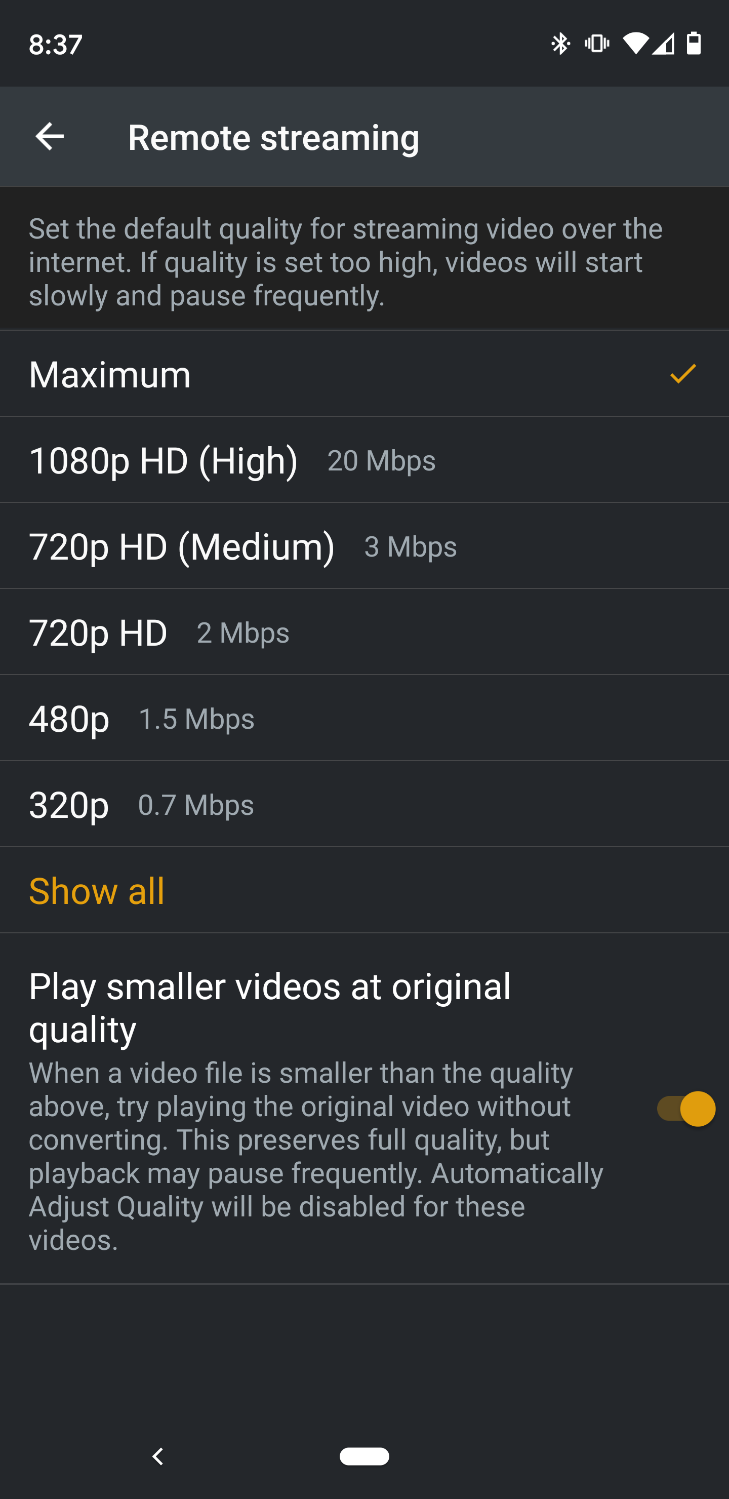 First, click on Remote Streaming. You may notice that there isn't an option for 'Original' or 'Maximum' like many other devices. This is because it is hidden by default.